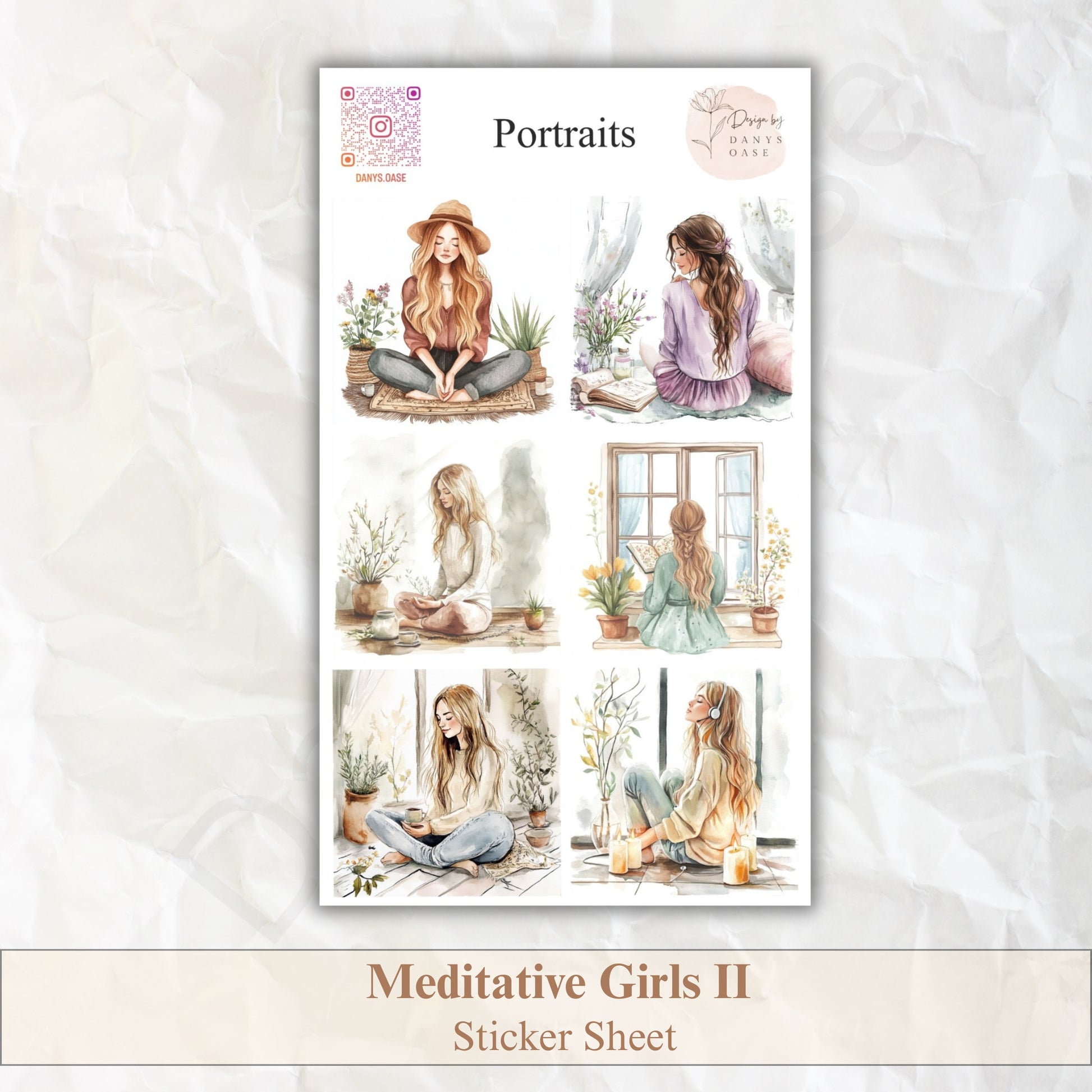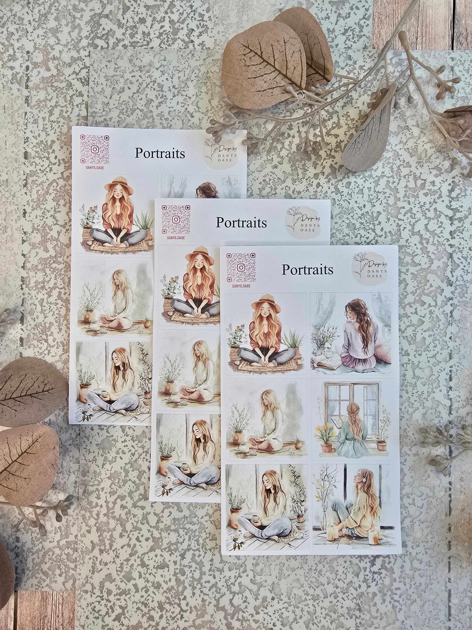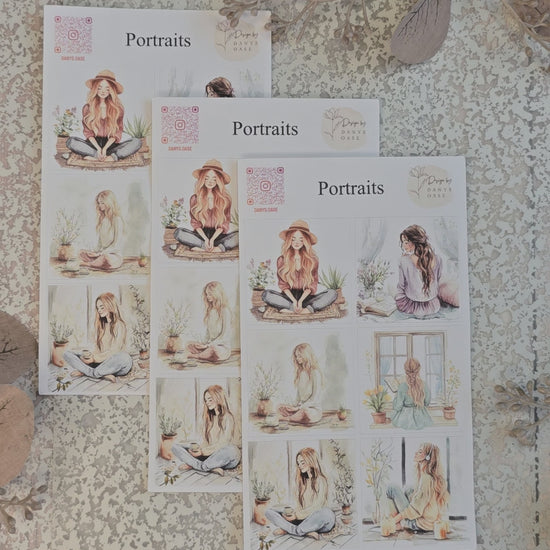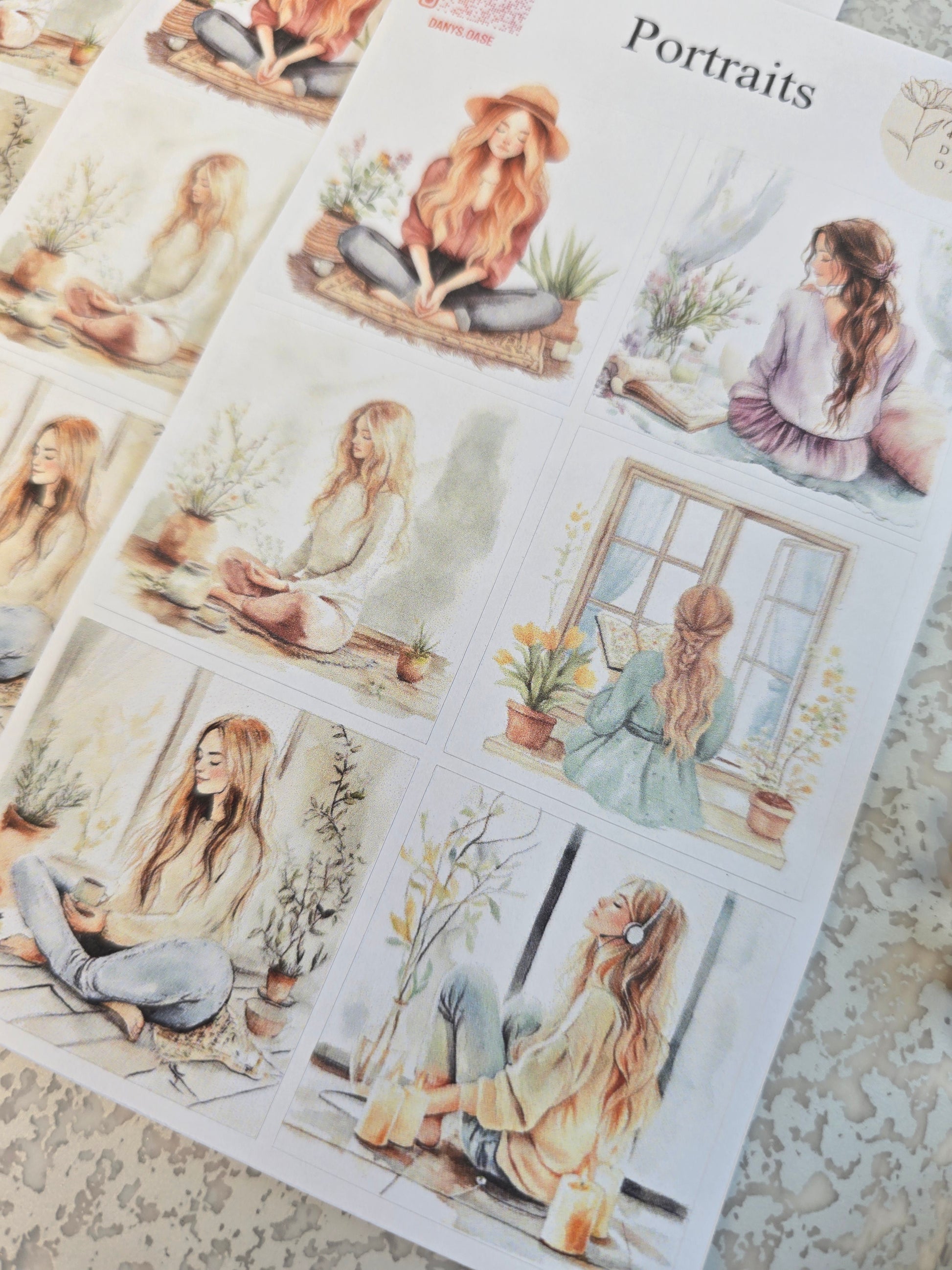 This delicate watercolor-style sticker set features six different portraits of quiet moments—ideal for your creative journaling projects, collages, or as a loving detail on gifts.