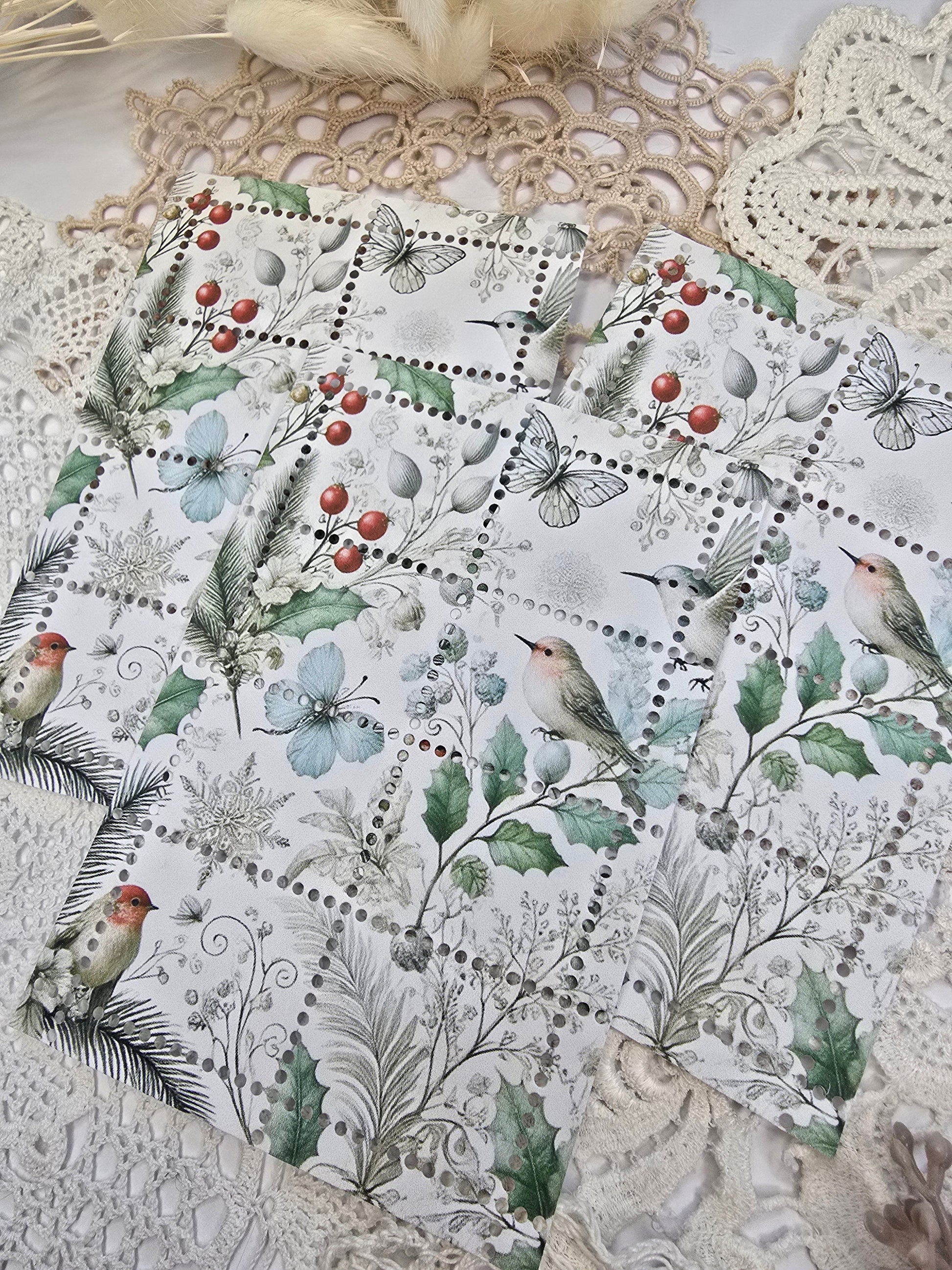 Diese handgestanzte Briefmarke zeigt eine ruhige, botanisch angehauchte Winterszene mit Rotkehlchen, Schmetterlingen, Schneekristallen und feinen Blättern in gedeckten Grüntönen. Die leichten Aquarell-Elemente machen sie zu einem sanften Begleiter für Journals & Papierprojekte.