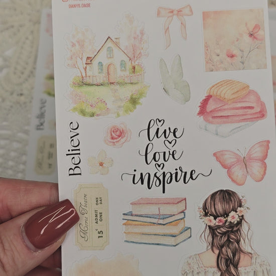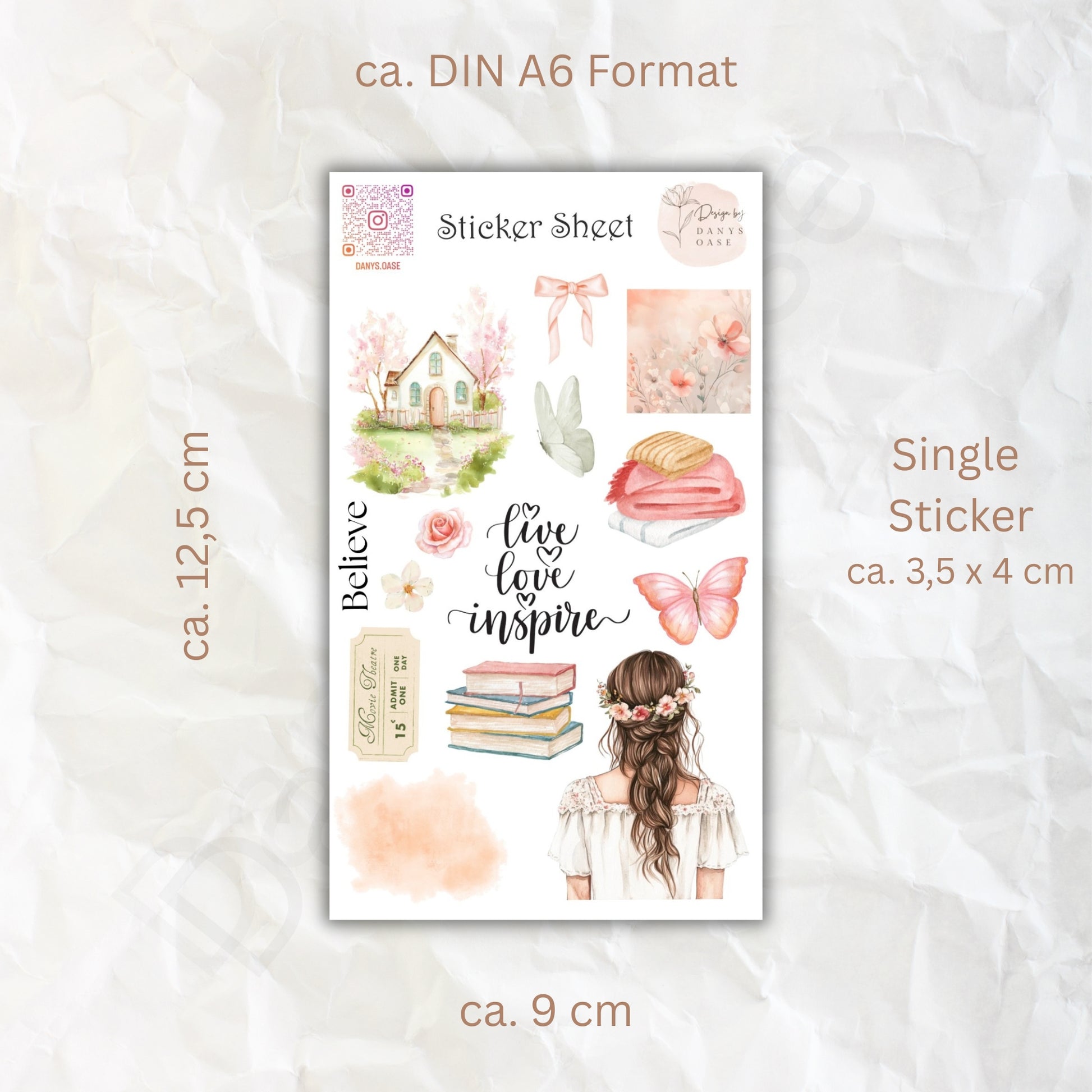 This dreamy sticker set combines delicate colors, romantic elements, and a soft boho aesthetic on a lovingly designed A6 sticker sheet. It contains 10 motifs – including a stylish girl figure, butterflies, flowers, small pieces of furniture, and inspirational sayings.
