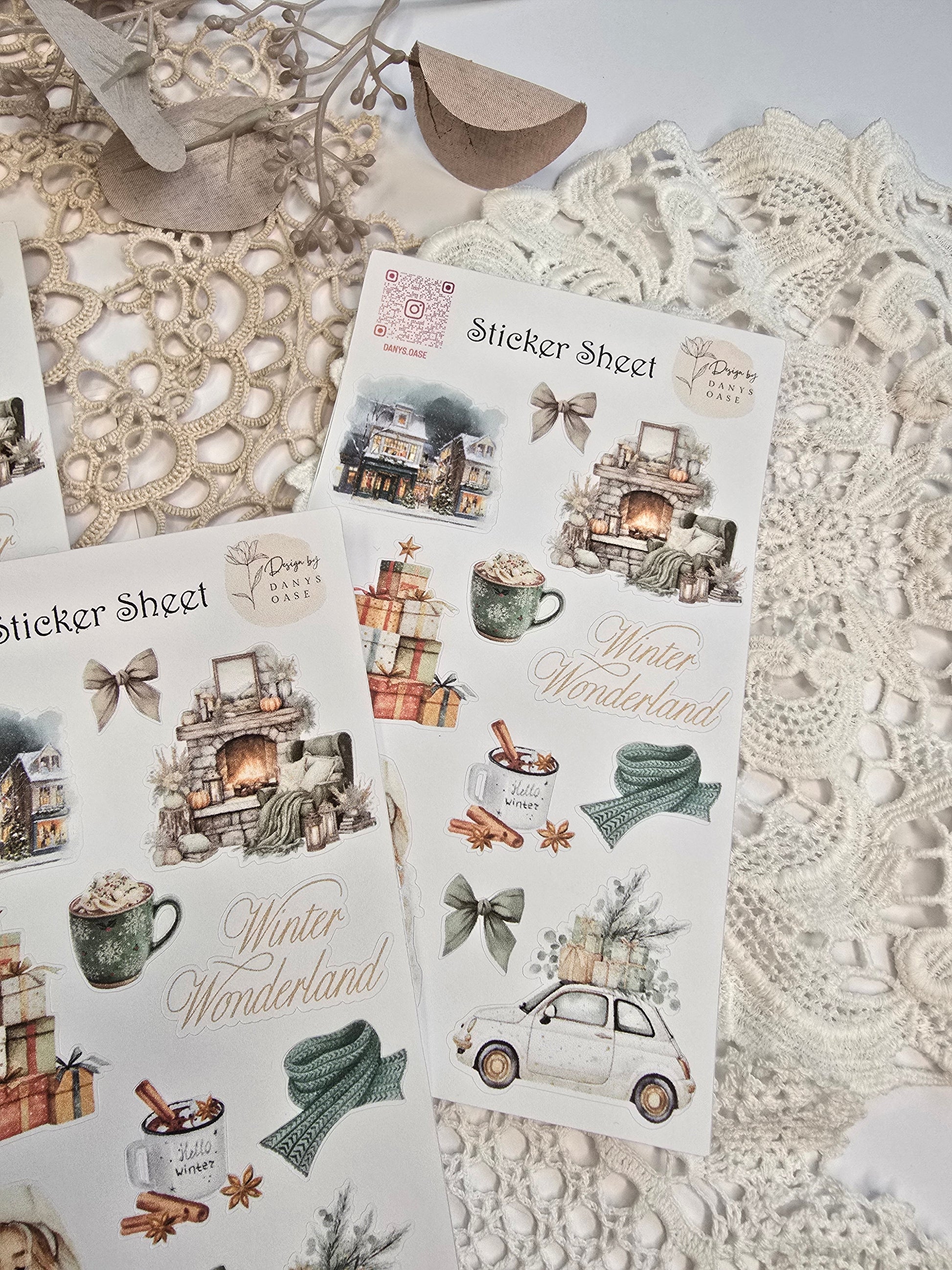 This atmospheric sticker set brings winter coziness to your paper. It contains 11 lovingly illustrated watercolor motifs: snow-covered houses, steaming cups, presents, a crackling fire, and warm winter accessories—perfect for creative projects on cold days.