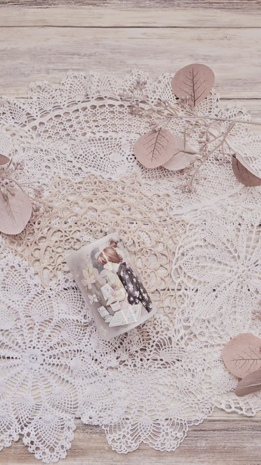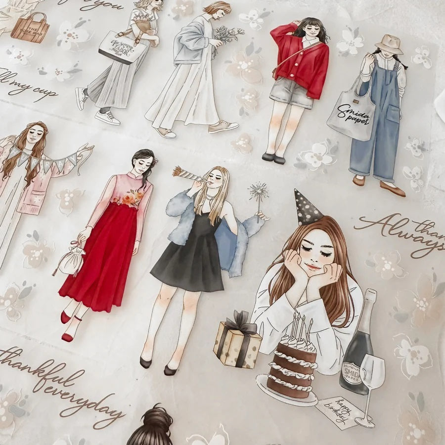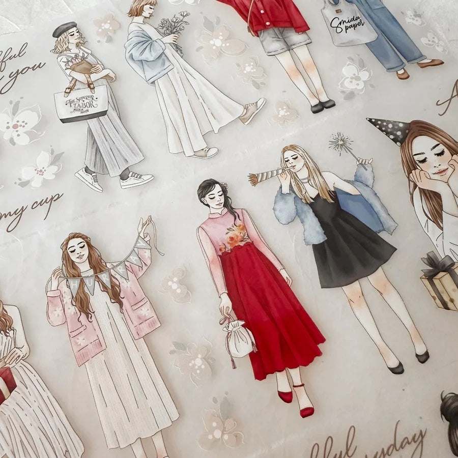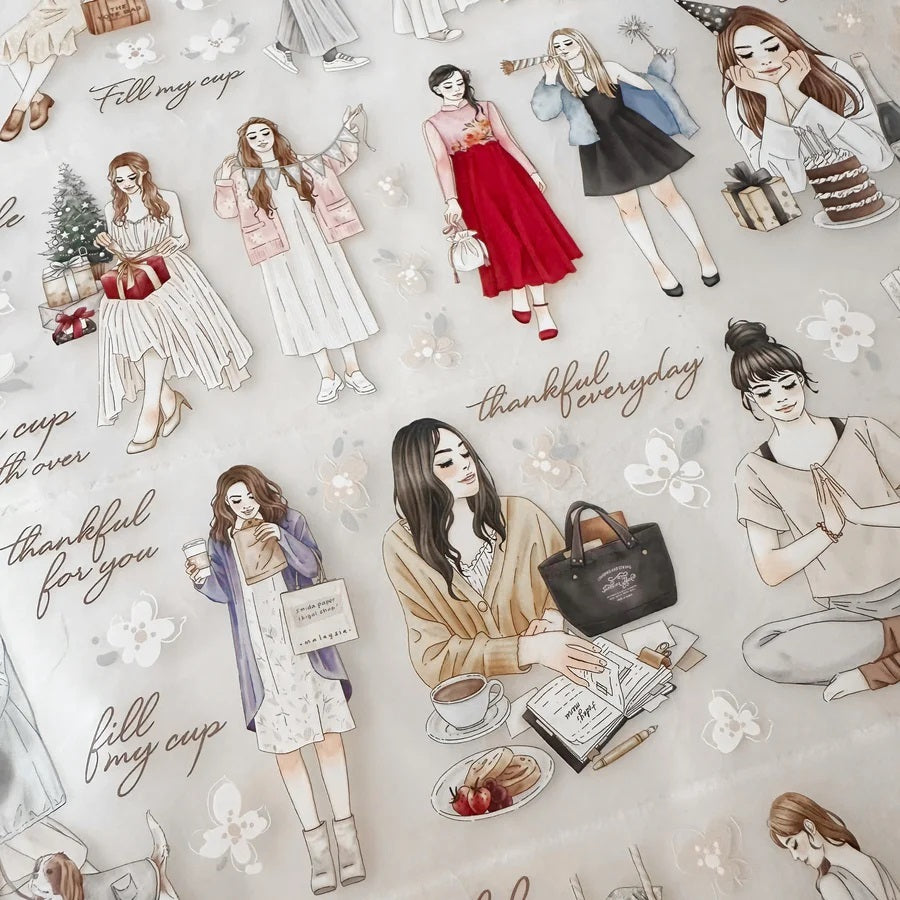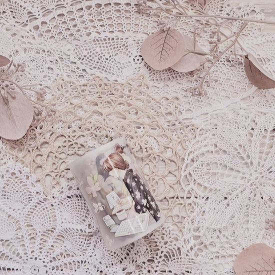 Das PET Tape „In my life“ ist eine poetische Kooperation von Smidapaper × Windry Ramadhina. Stilvolle Mädchenmotive in ruhigen Momenten – beim Lesen, Spazierengehen, Kaffeetrinken oder Träumen – begleitet von floralen Details und kurzen Zitaten. Ideal für Journals, Scrapbooks oder Papeterieprojekte mit introspektivem Charme.