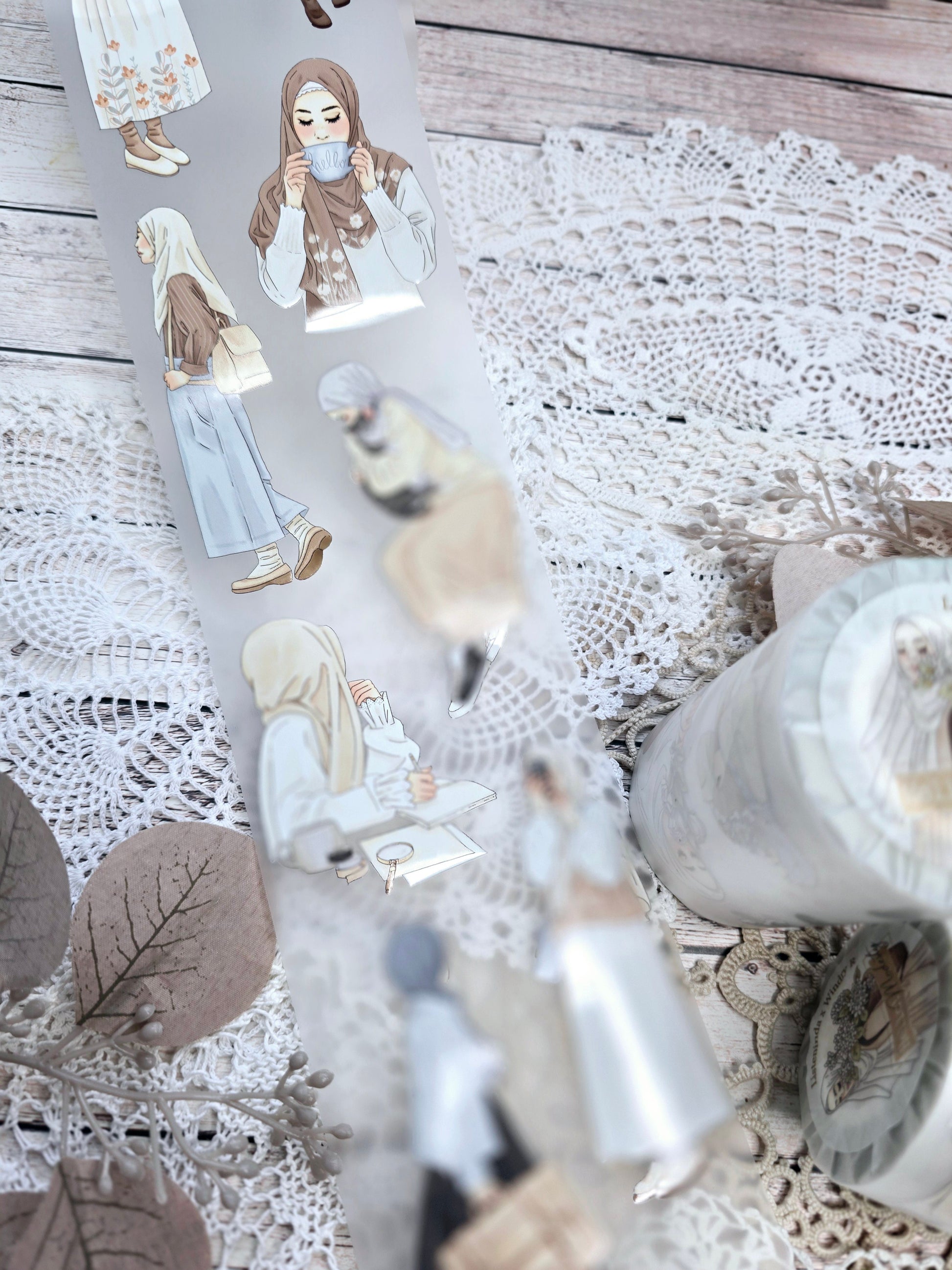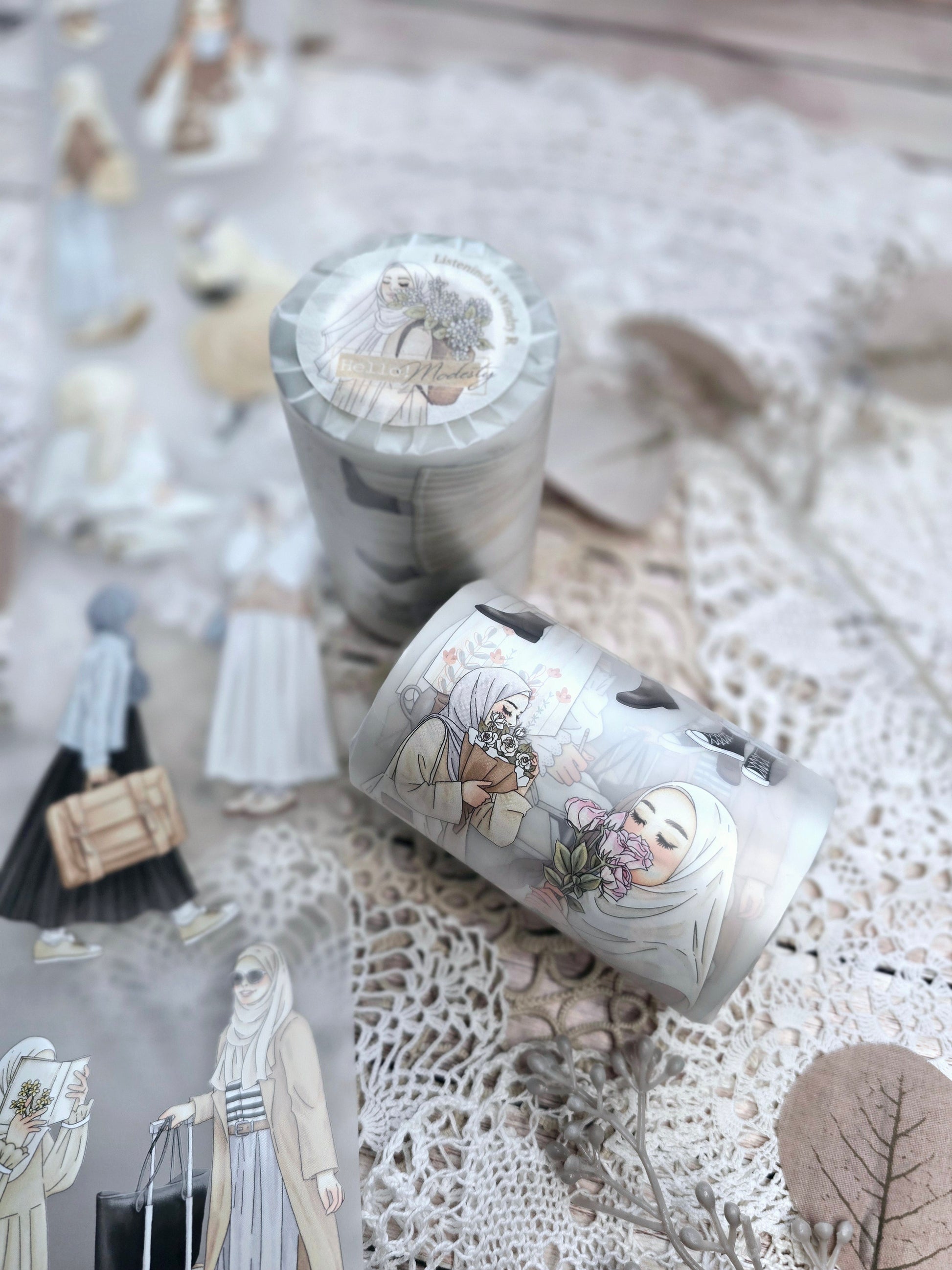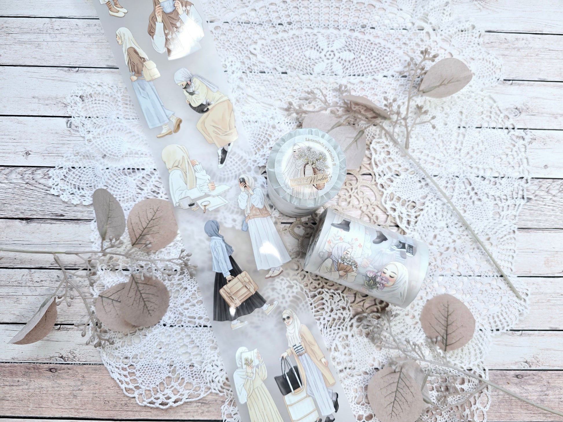 Das „Modesty“ PET Tape wurde von Listeninda × Windry Ramadhina entworfen. Mädchen- und Blumenmotive in ruhigen Farben bringen stilvolle Akzente in Journals, Collagen und kreative Projekte.