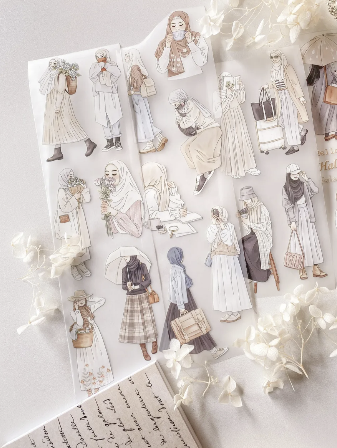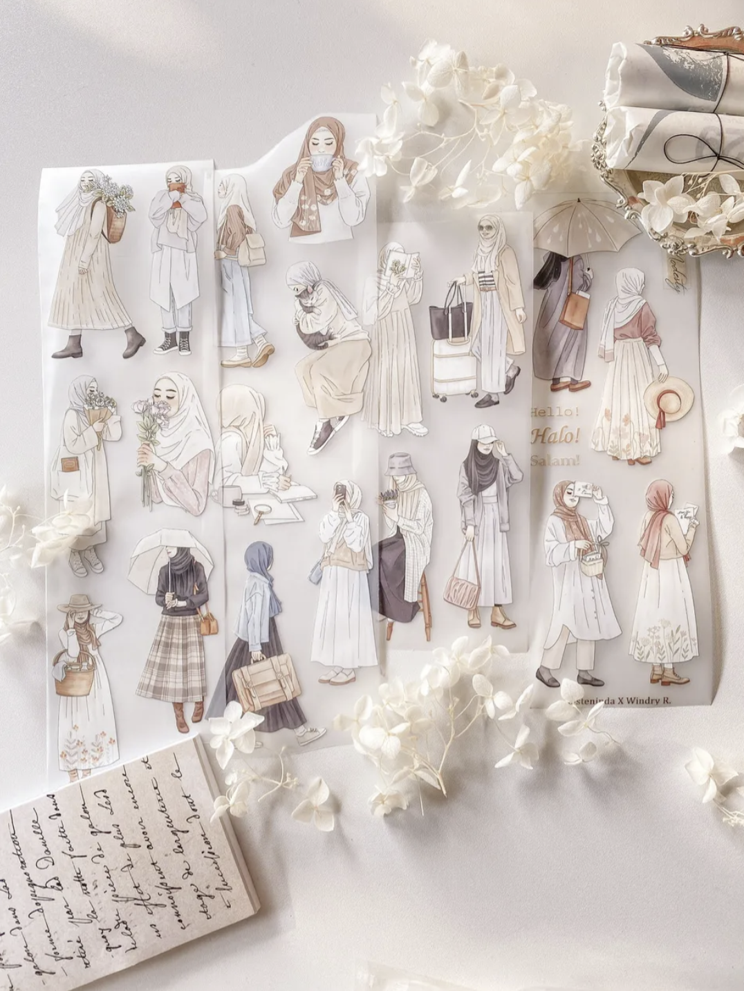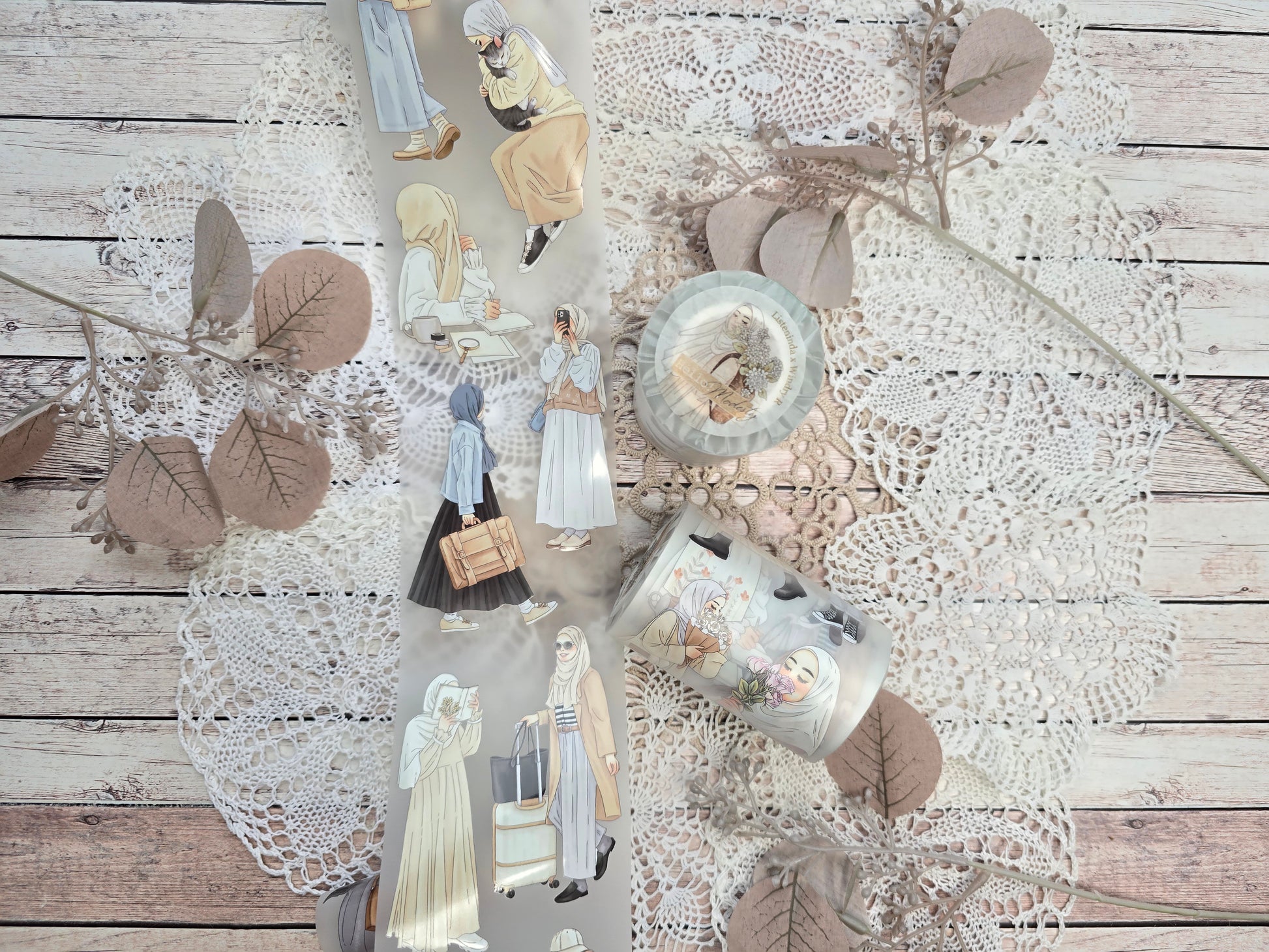 Das „Modesty“ PET Tape wurde von Listeninda × Windry Ramadhina entworfen. Mädchen- und Blumenmotive in ruhigen Farben bringen stilvolle Akzente in Journals, Collagen und kreative Projekte.