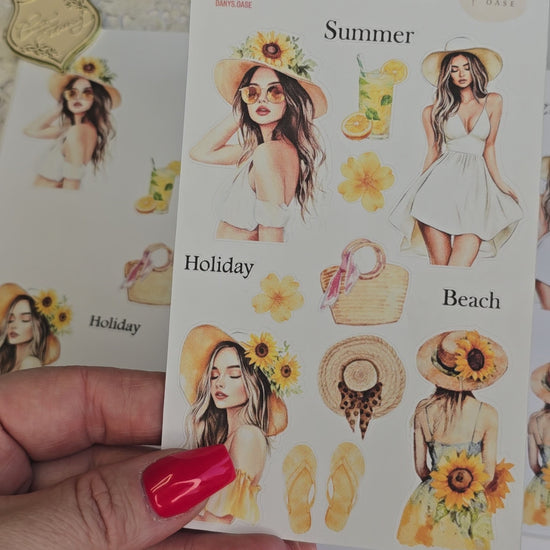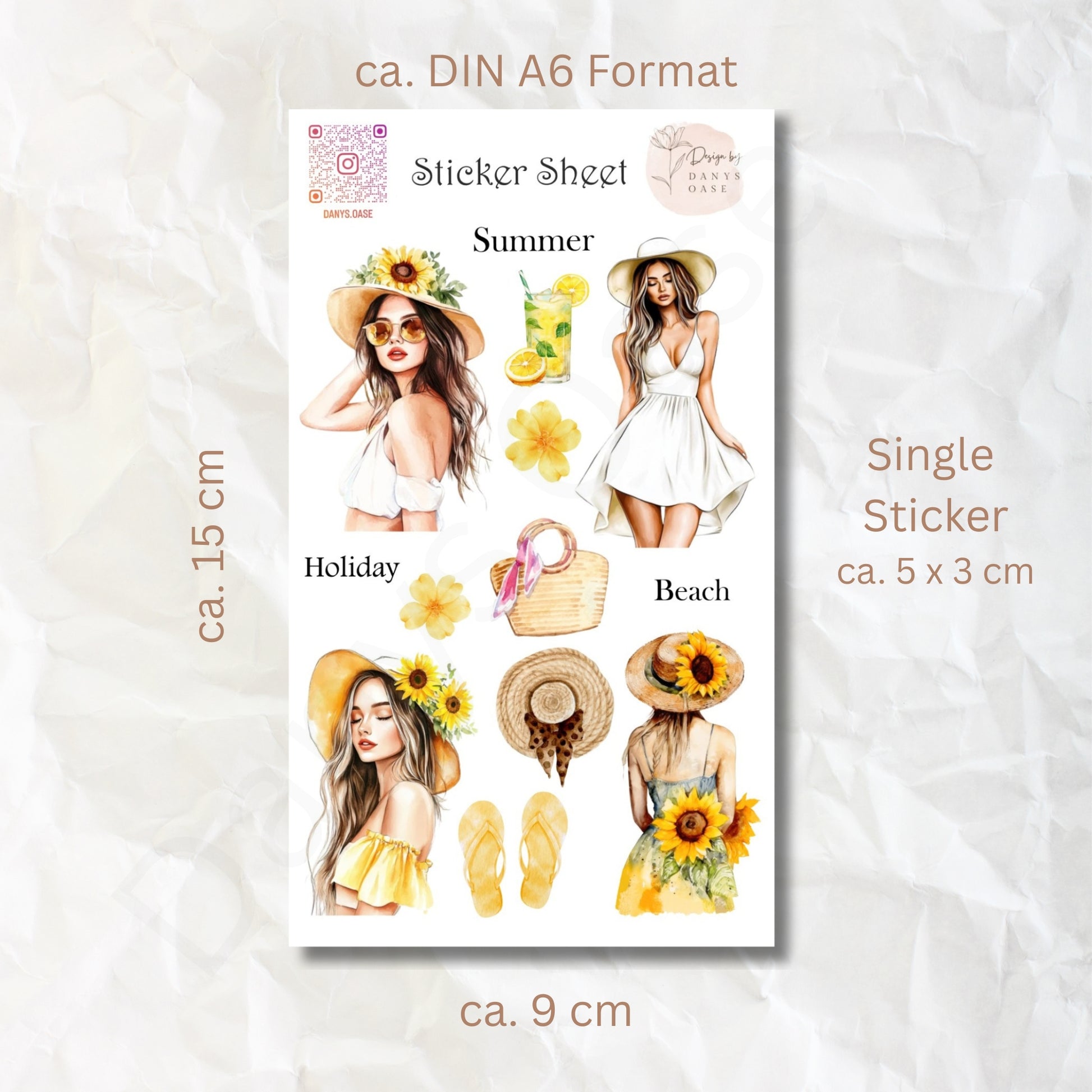 Dieses stilvolle Sticker Set bringt sommerliche Leichtigkeit in deine kreativen Papierprojekte. Die 12 Motive zeigen Frauen mit Sonnenhüten, luftige Kleider, Flip-Flops, Zitronendrinks, Basttaschen und Sonnenblumen – perfekt für Journals, Scrapbooks, Moodboards oder dein nächstes Reisealbum.