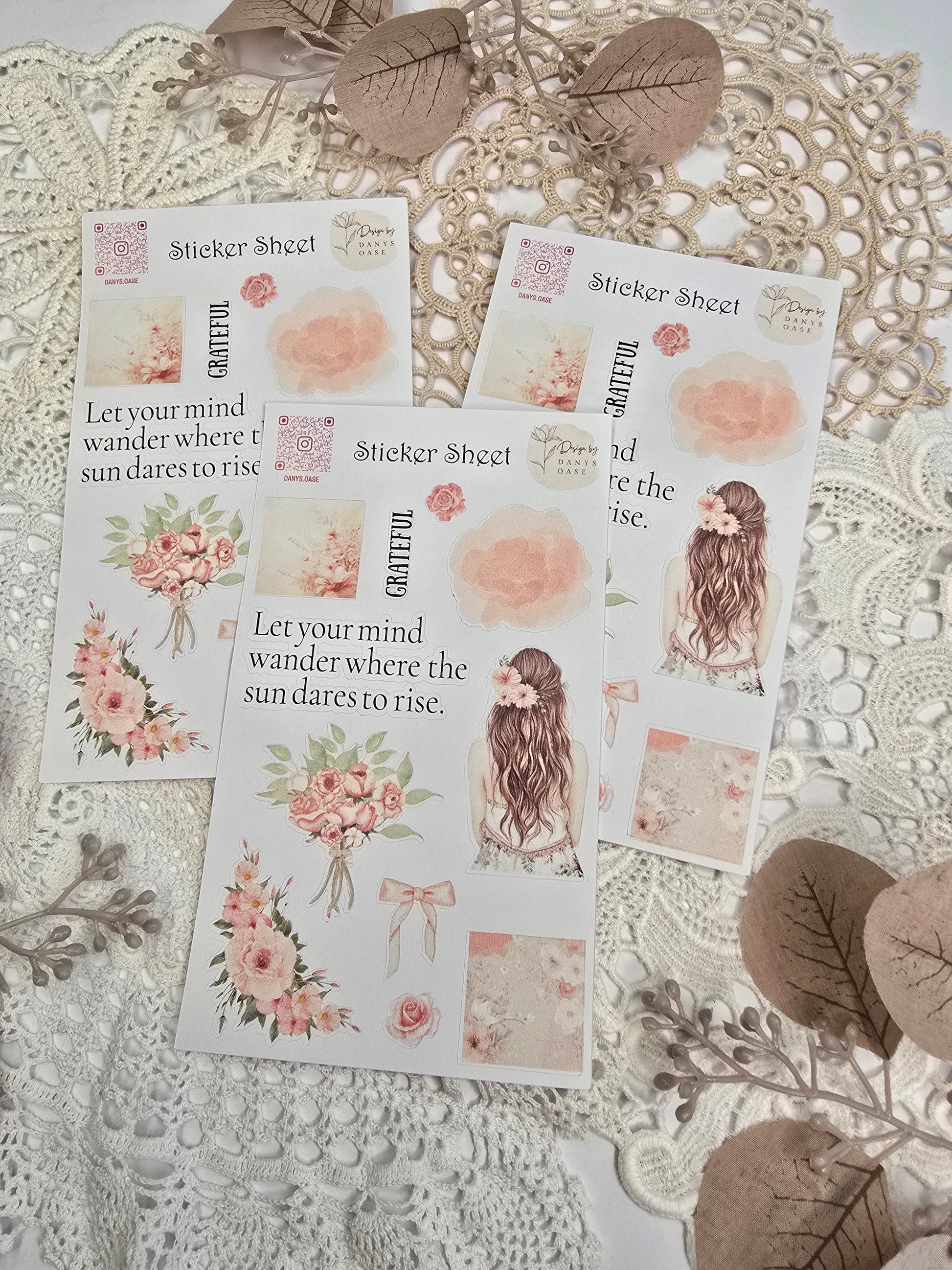 Dieses romantische Sticker Set im Pastell-Boho-Stil verleiht deinen kreativen Projekten eine besonders zarte Note. Enthalten sind 11 liebevoll illustrierte Motive: eine verträumte Mädchenfigur, Blumen, Schleifen, kleine Textelemente und stimmungsvolle Hintergründe – perfekt für persönliche Gestaltungen mit Gefühl und Stil.